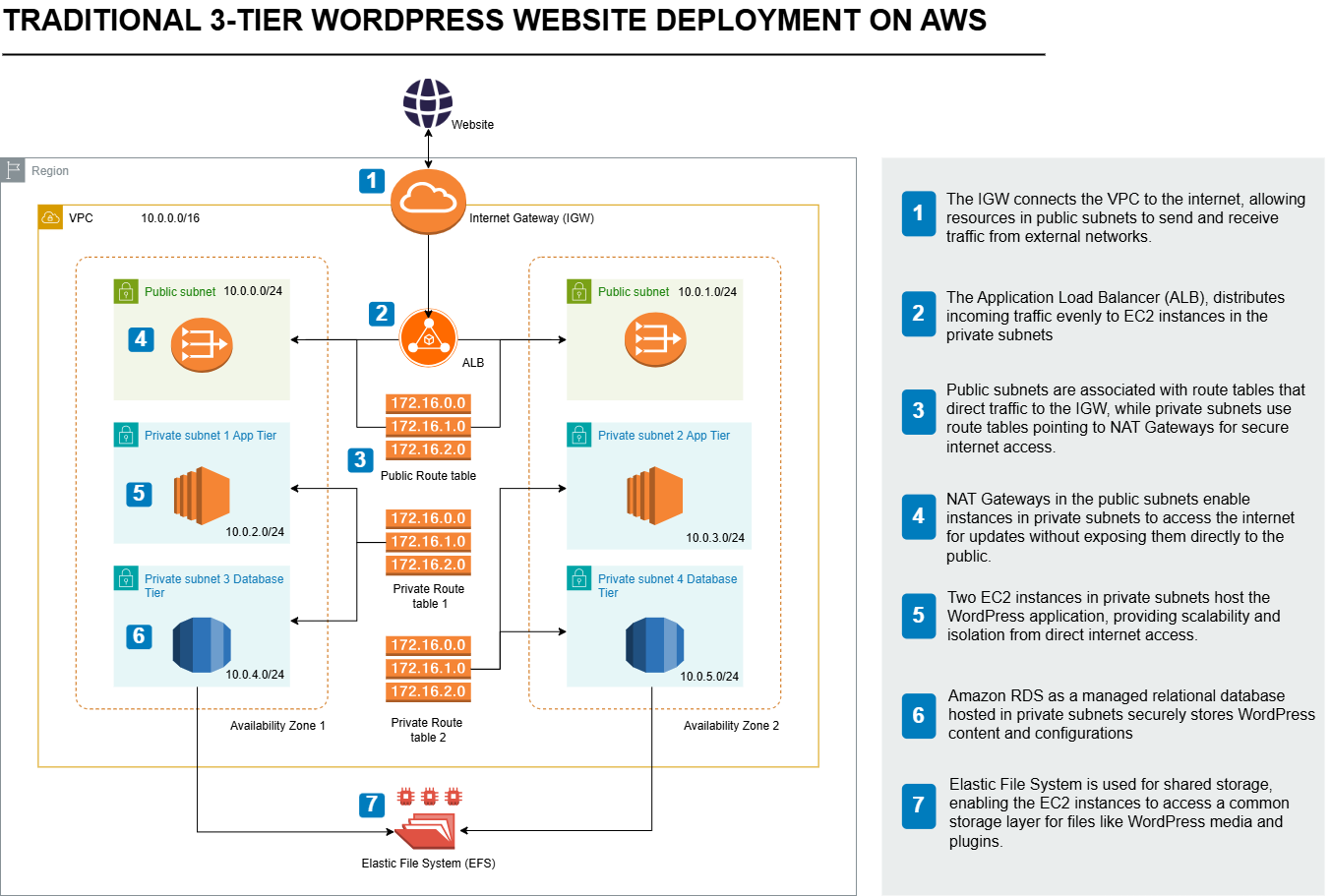- This project involves deploying a WordPress website using a 3-Tier Traditional Architecture on AWS. The architecture ensures scalability, reliability, and security for hosting the website. Key components include: