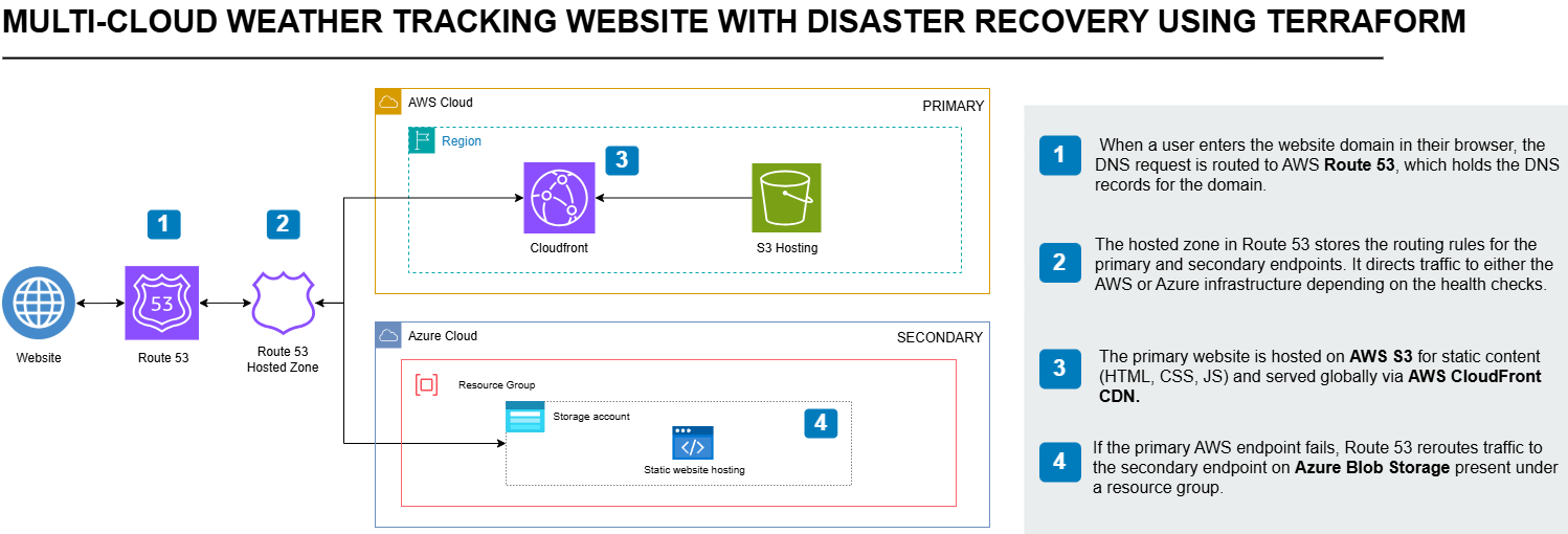 This project involves deploying a weather tracker application across AWS and Azure, incorporating disaster recovery capabilities. The app's front-end (HTML, CSS, JS) is hosted statically on AWS S3 (with CloudFront for CDN) and Azure Blob Storage.The entire infrastructure is managed using Terraform, automating deployments on both cloud platforms.